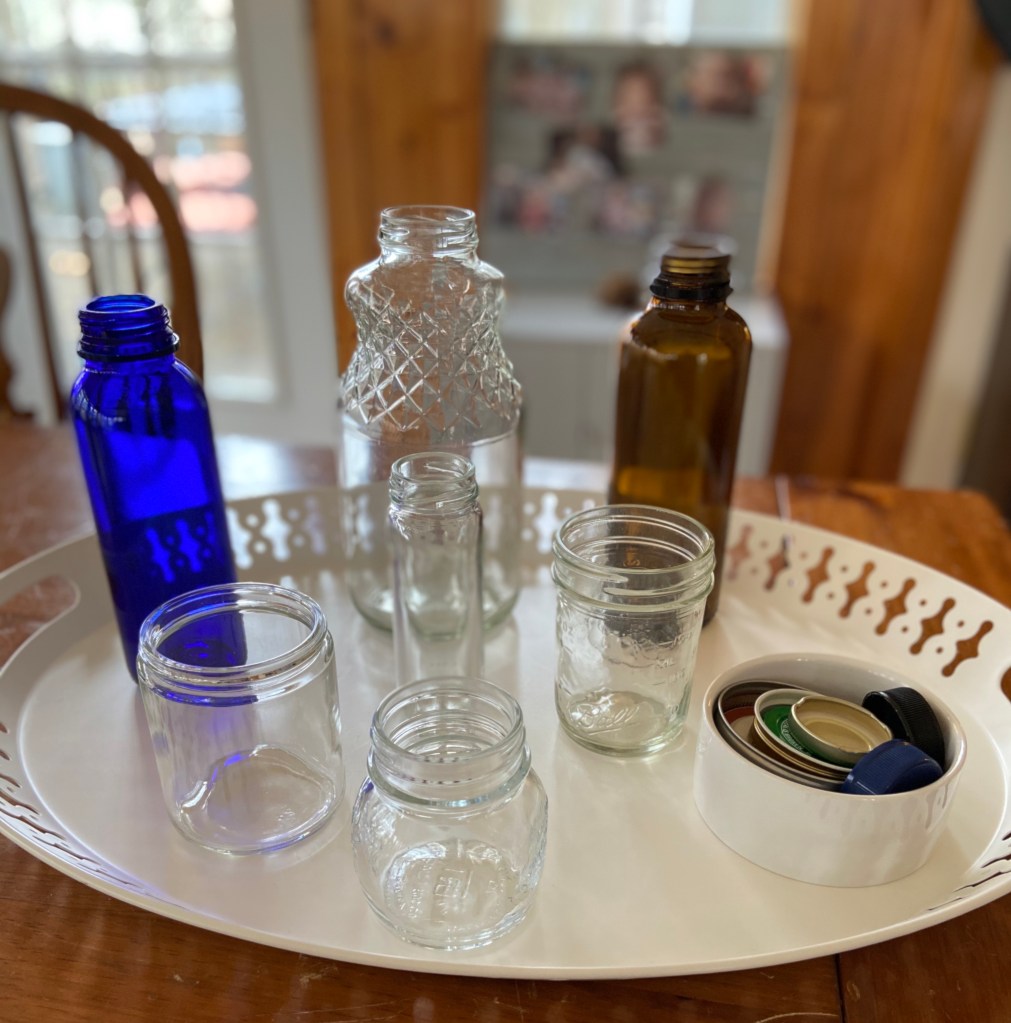 I had the idea to use the same materials from the previous activities and add in a few things like magnifying glasses and funnels. I used the trays and the cloth again, and since the weather was gorgeous, I was able to set it all up outside on the table. They enjoyed scooping the grain into the jars, putting the lid on, and dumping it from container to container. My 2-year-old explored the outdoors through the blue and brown glass and inspired his big sister to do the same.