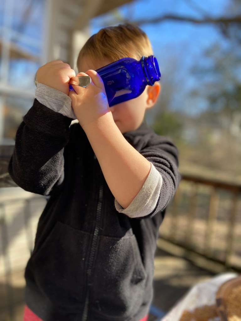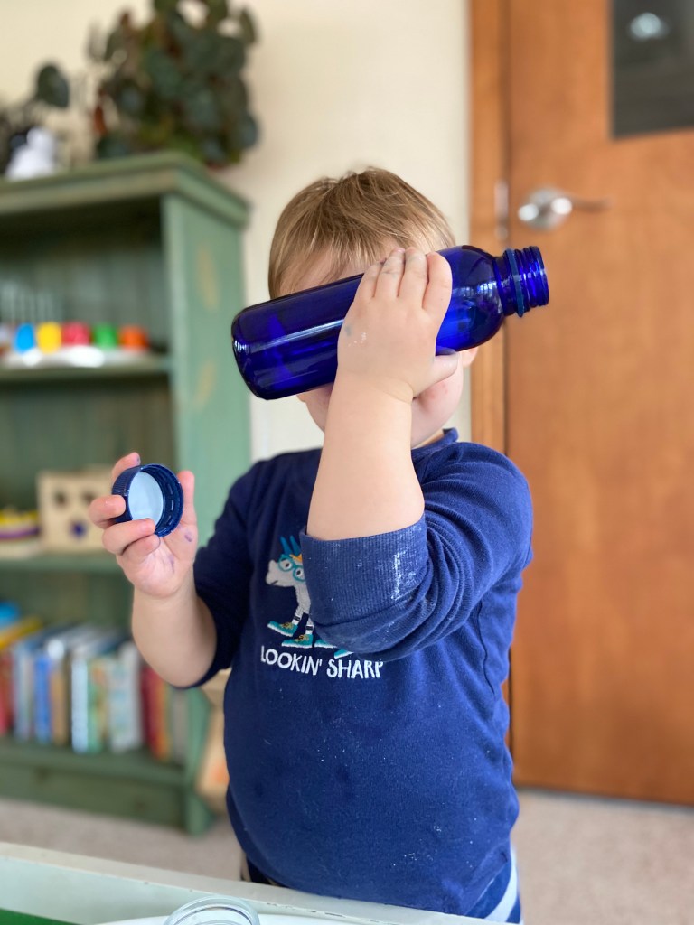 My 2-year-old fiddled around with the lids, dropping them into jars, with no particular goal in mind. He took the ring from the mason jar and put it around one of the smaller jars, and tried-out putting multiple lids on one jar. The blue bottle caught his eye and he held it up and looked through it. He rotated his head and body to look around the room that had suddenly become a whole new world.