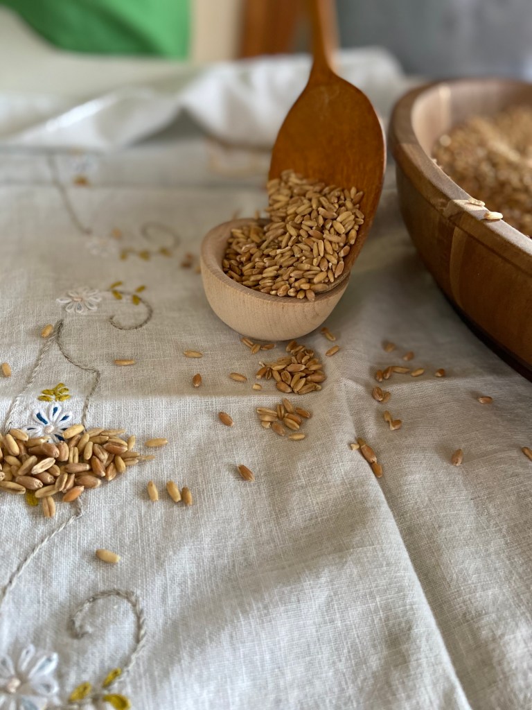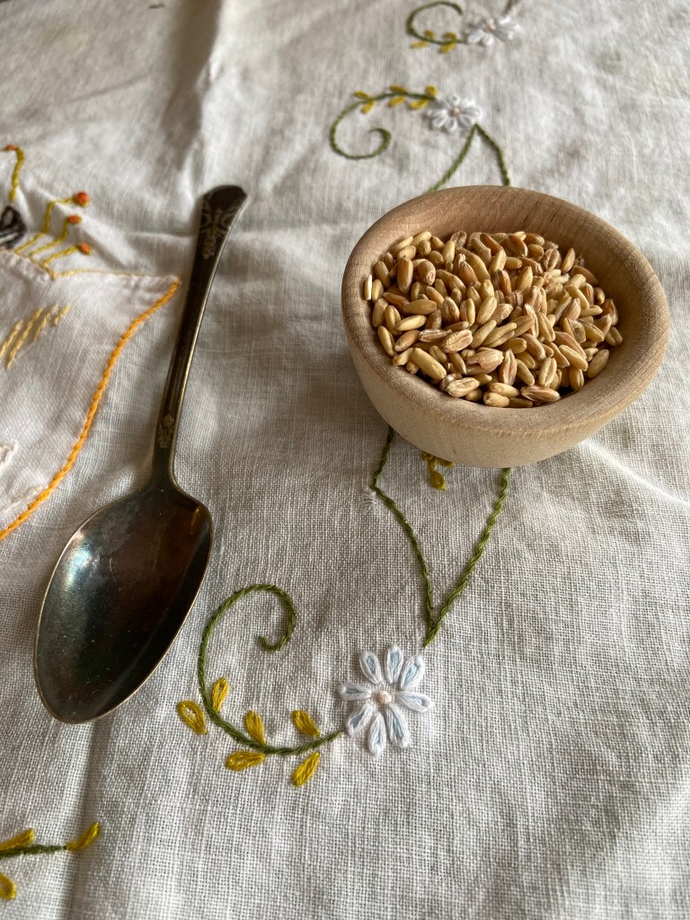 I had some (very) old whole oats and spelt in the pantry, so I thought they would be interesting for the kids to play with. While I generally try to stay away from using food for play–both because there are people around us in need and because I want to avoid waste–this was way past the point of being fit for human consumption. You can really use anything for this–sand, pea gravel, or if you’re like me, there’s probably some rice or oats or something in the back of your pantry you wouldn’t dare eat.
