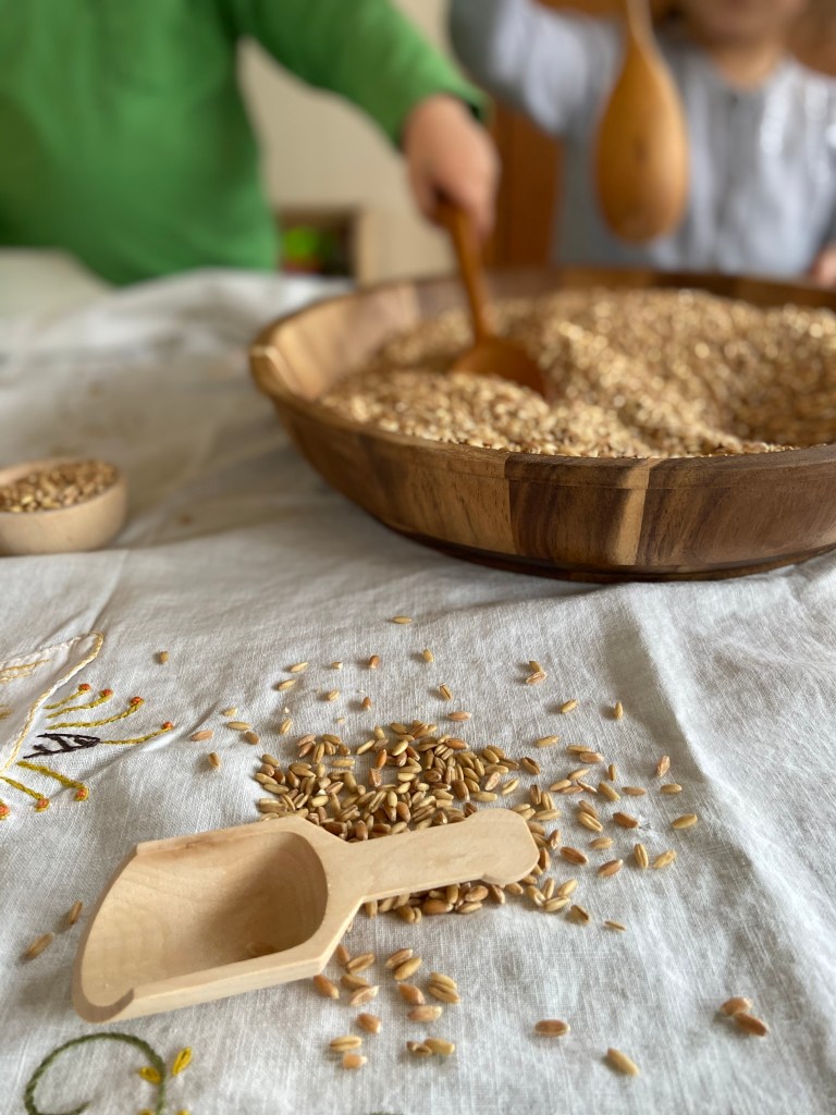 To set up, I laid out a cloth to (sort of) keep things contained, and I added some items to fill, scoop, and stir. Any kind of container will work here, but preferably something shallow that allows the kids to see over the edge and interact easily. I told the kids that everything should stay on the cloth–which it obviously didn’t totally–but it did keep it from spreading across the entire room. They quickly took most of the spoons and bowls out, ran their fingers through the grain, watched it fall from their fingers, and then took to filling the bowls and serving me, each other, and perhaps a few imaginary friends. When it was time to clean up, the cloth did help to round up stray bits, and then the kids helped to sweep up the rest.