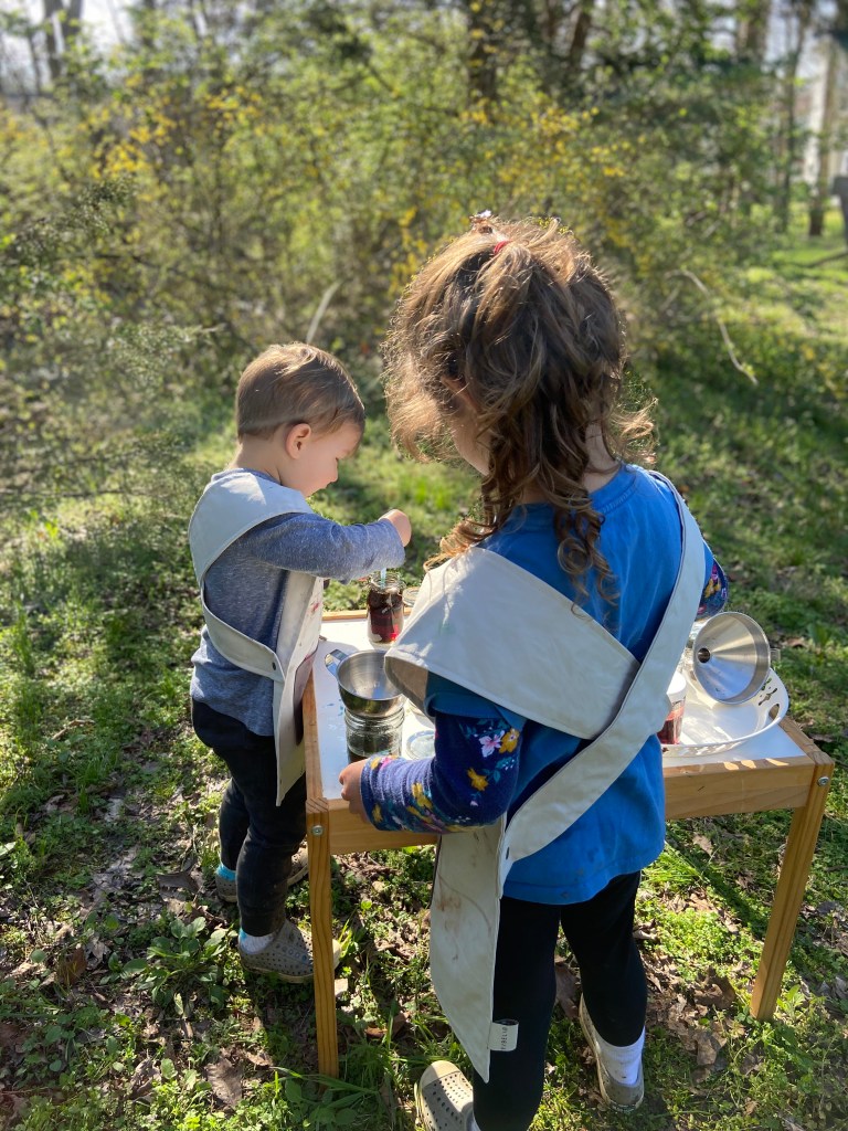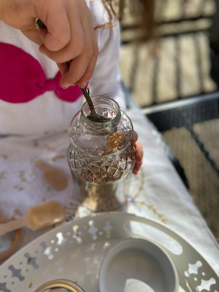The first time I laid out this activity, I gave the kids time with it separately. Part of this was just out of curiosity about what they’d do, and part of it was to just give some space to each of them. My 5-year-old approached the tray and quickly had the lids sorted and screwed on. She had a good time taking them off again and then she was off in her imagination pretending to pour, cook, and serve to, well, I’m not really sure, but she knew.