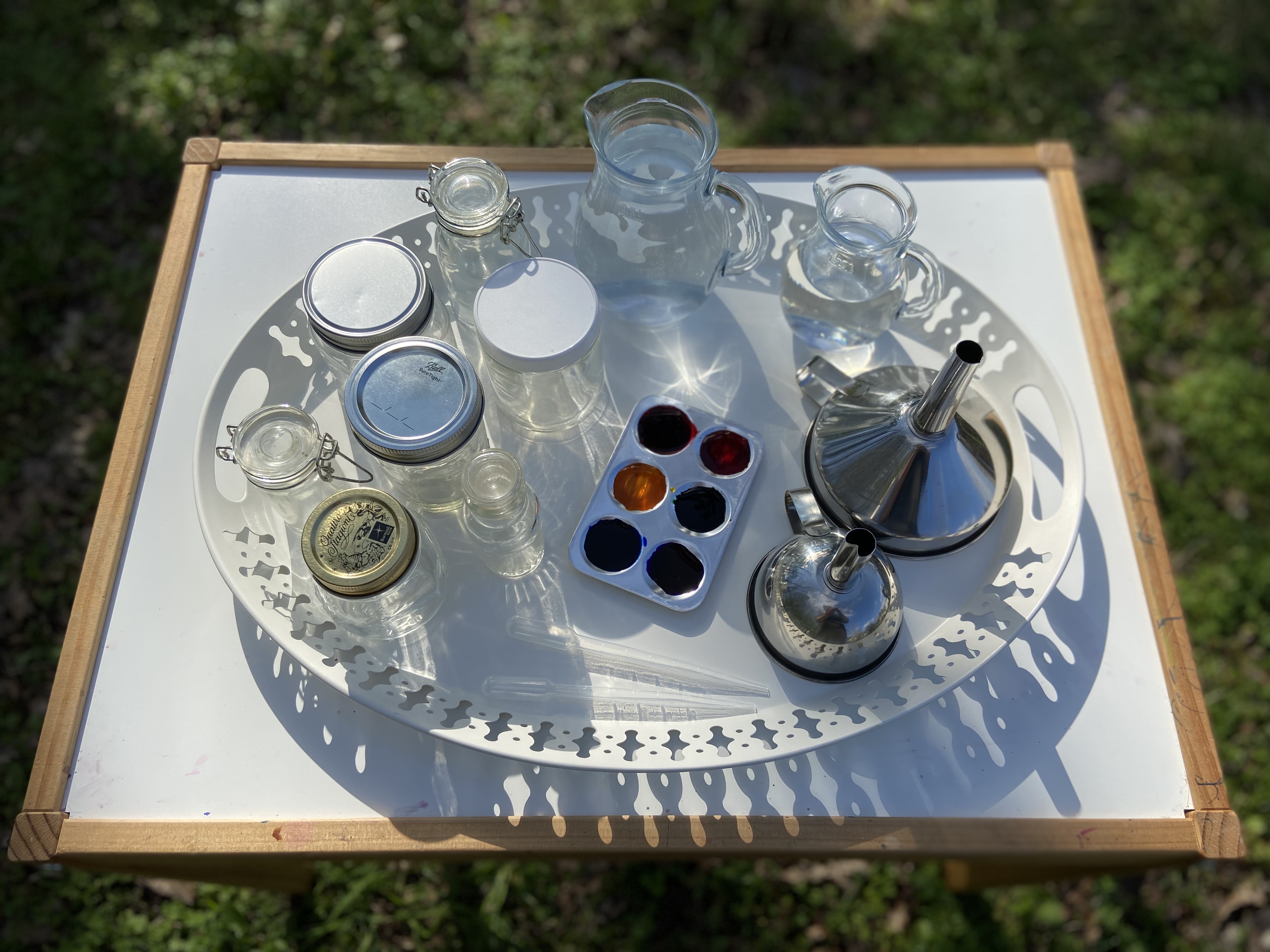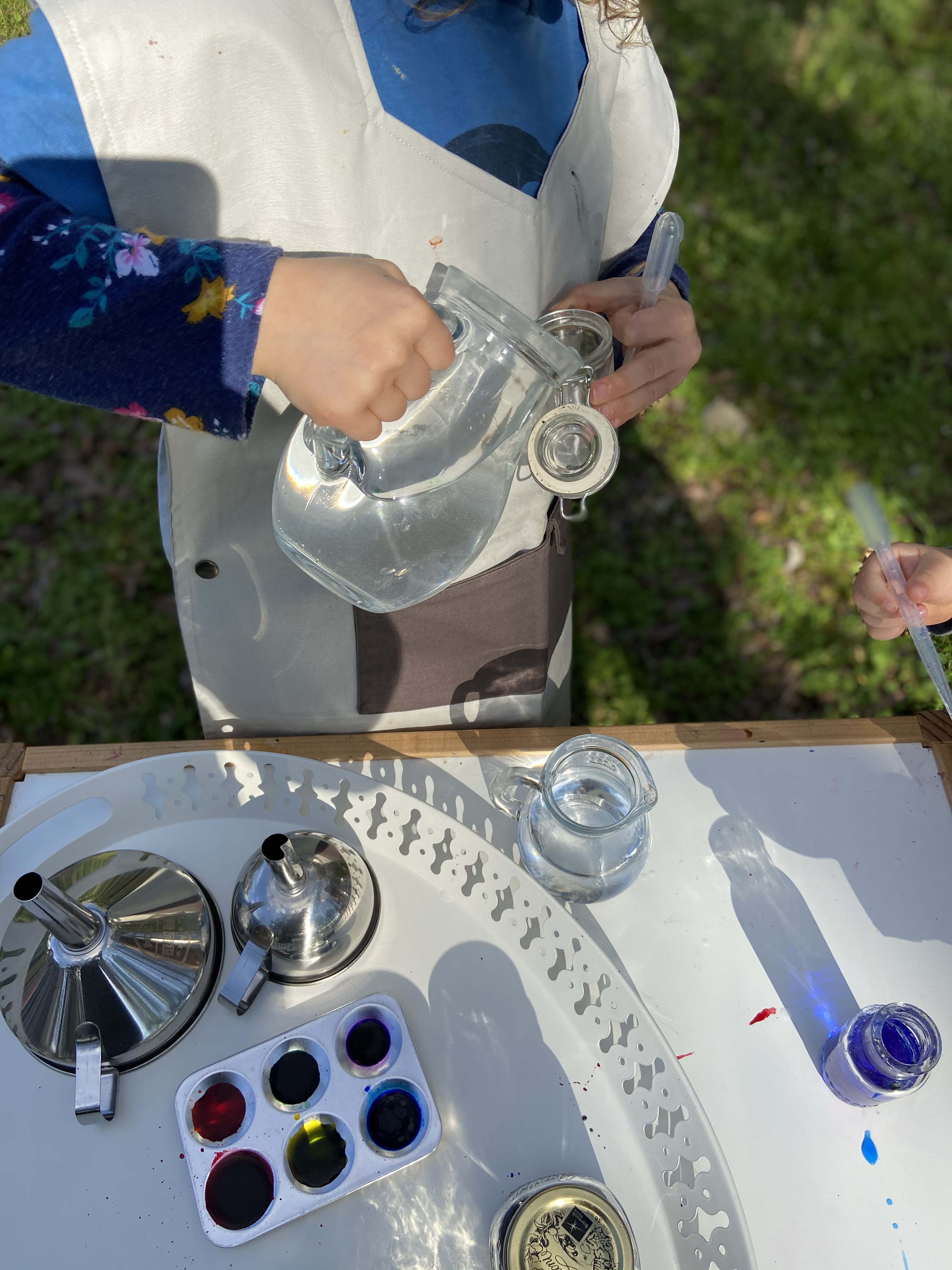 Using the same funnels and some of the smaller bottles, I set out an activity with a pitcher of water, baby oil (any kind of colorless oil will work here), and liquid watercolors (food coloring would be a good substitute if you don’t have liquid watercolors on hand). I also included pipettes/eye droppers for using with the watercolors.