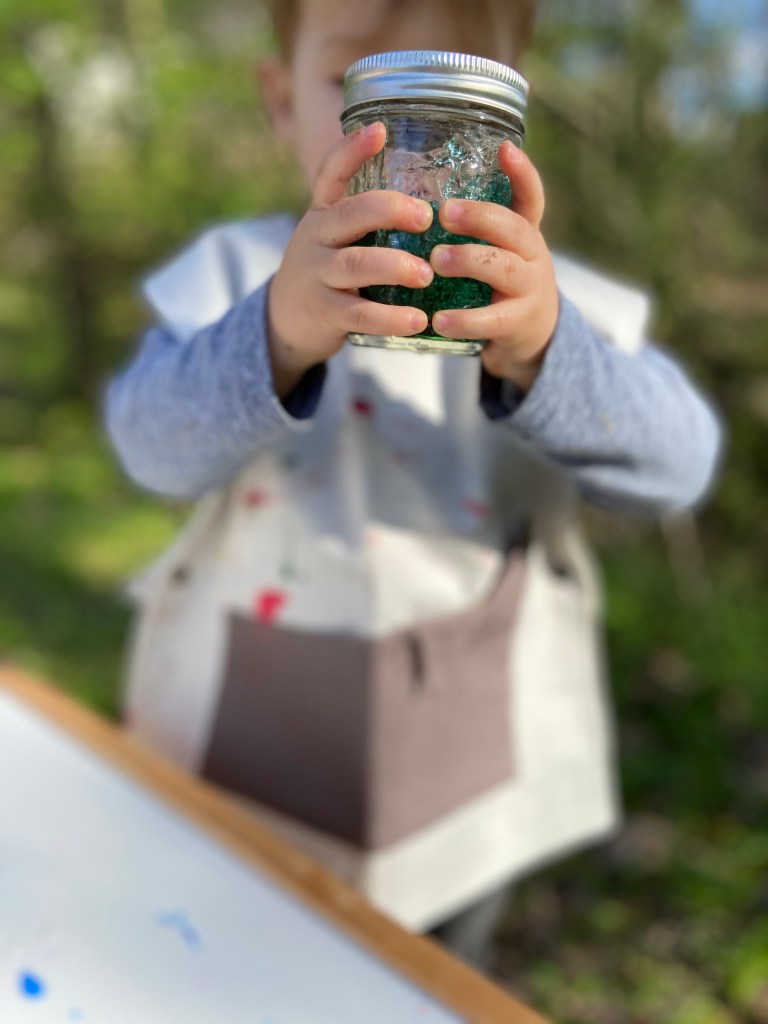 After watching both of the kids interact with the same activity, I realized I didn’t have anything to worry about when it came to allowing room for creativity. They both ended up using the jars and lids for something other than on and off (although that in itself is excellent for developing fine motor and cognitive skills).