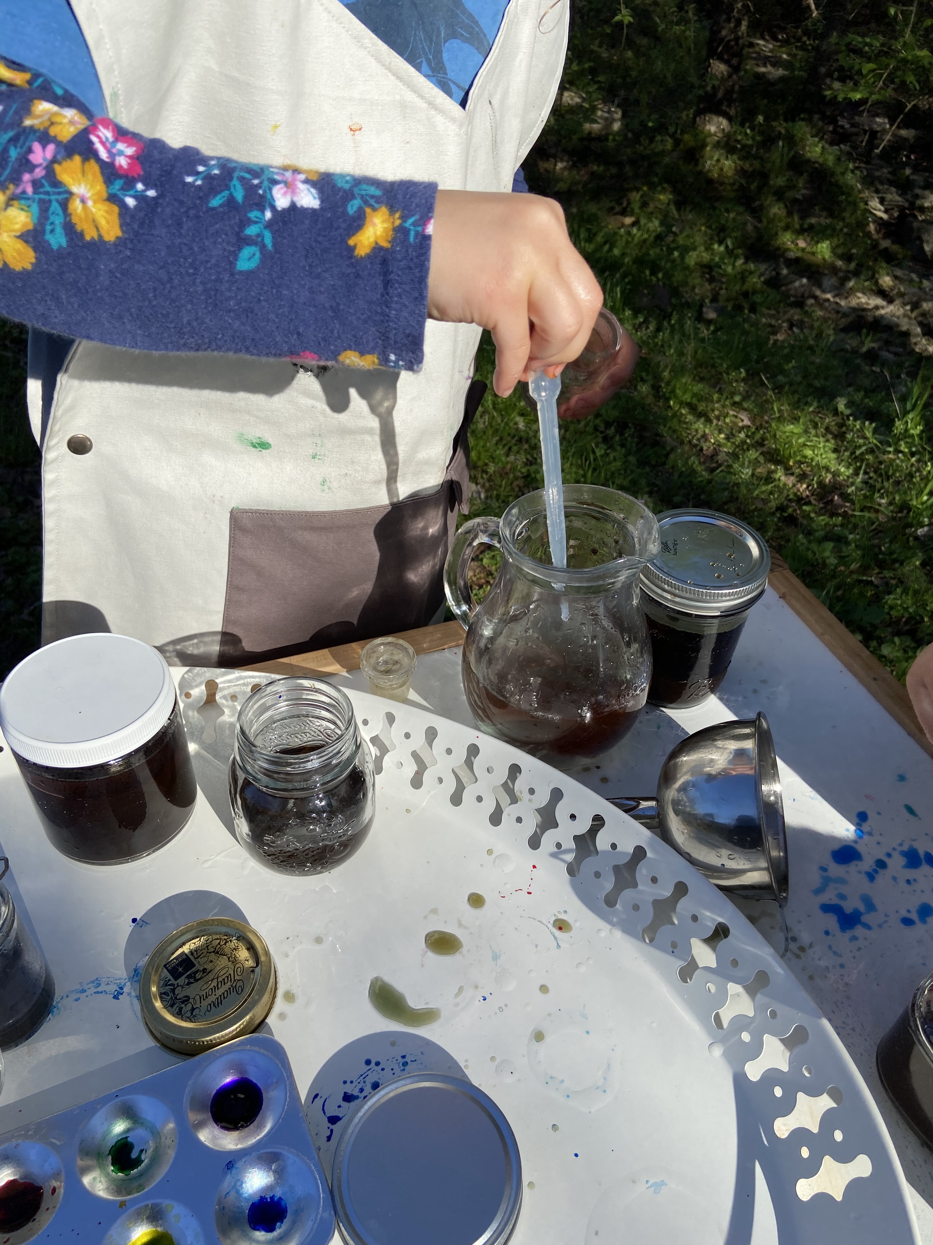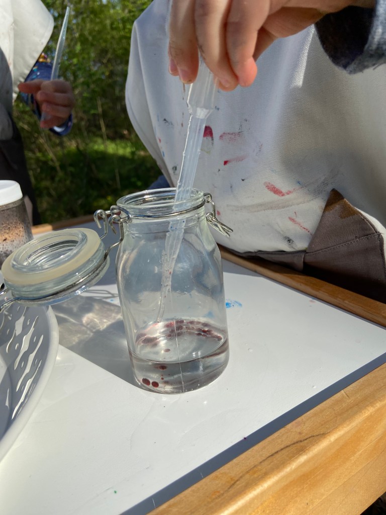 While my daughter had worked with pipettes before, this was an introduction for my son. It didn’t take him long to figure it out, and they both had a great time first with the paint, and then mixing everything together by the end. They also experimented with pouring from the pitcher, but also from jar to jar.