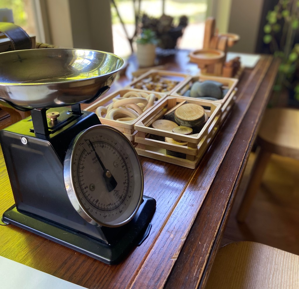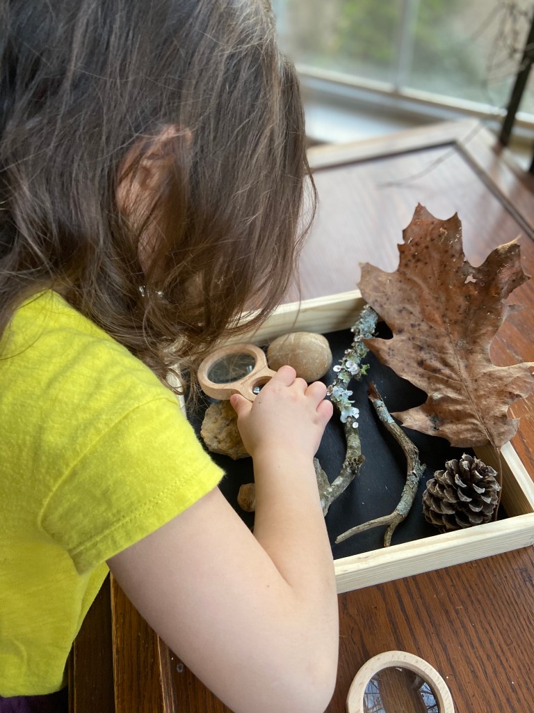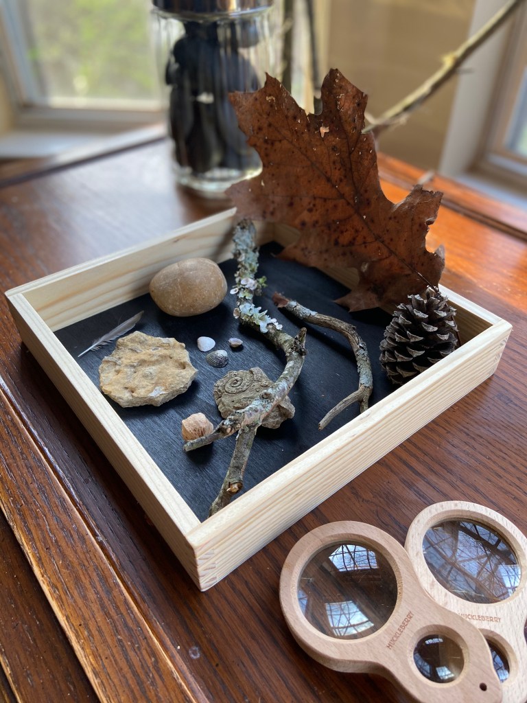 I have also found the nature center to be a great place to put out a variety of activities. When the kids come downstairs in the morning, they often stop by the nature center and look at/touch some of the things that are out. I’ve been brainstorming about how I can add little surprises for them to wake up to–like little provocations to start off their day. Creating the nature center has been a satisfying creative outlet for me. It has also helped me to look at the other spaces inside and outside in a more open-minded way. Hopefully the next time I’m rearranging our space it will be without the prompting of the dog’s bladder.