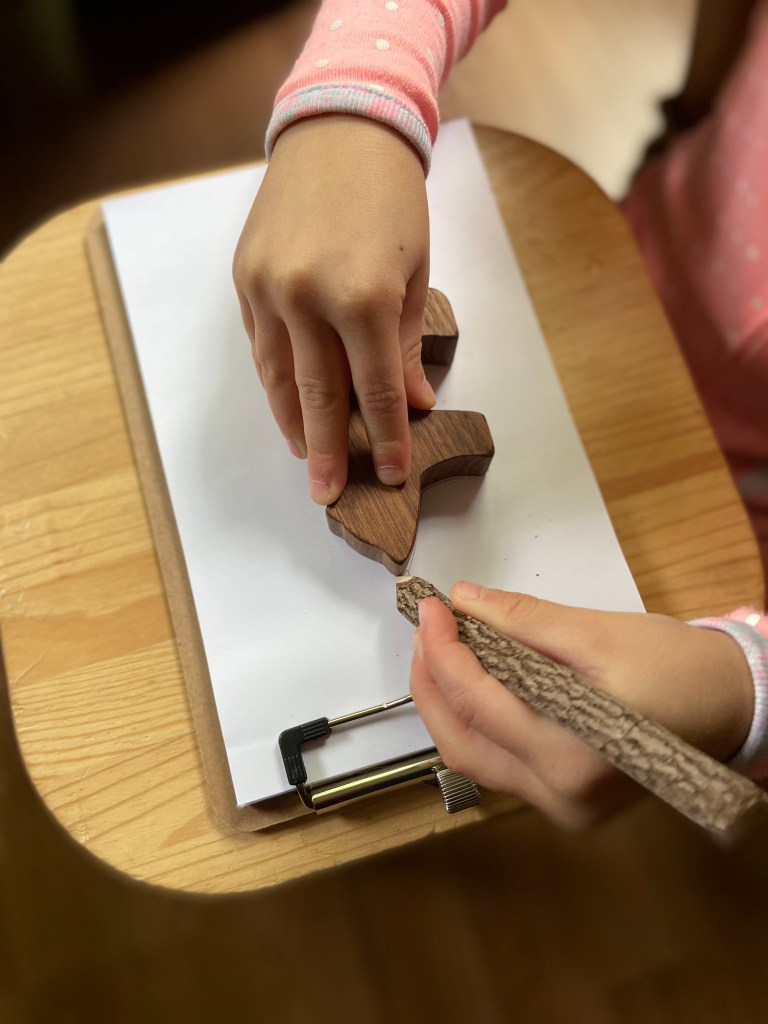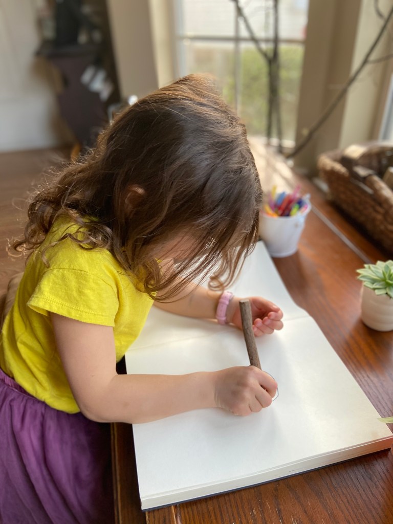 My 5-year-old had a chance to explore the nature center first since her younger brother was still napping, and she was surprised and delighted with the branches (“Look, Momma! There are trees inside!”). She looked around at everything and then started by touching some of the smooth stones in the jar. She noticed the magnifying glasses and used one to check out the items on the tray. Then–here’s the best part–she asked to sketch some of the items on the tray. I totally had one of those “why didn’t I think of that?!” moments while she went to get her sketch pad and some crayons. She drew a circle and called it a rock, and then said, “no, I’m going to draw a girl holding a rock”, so the rock became the girl’s head.
