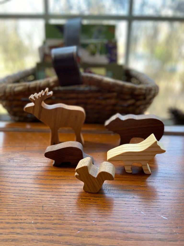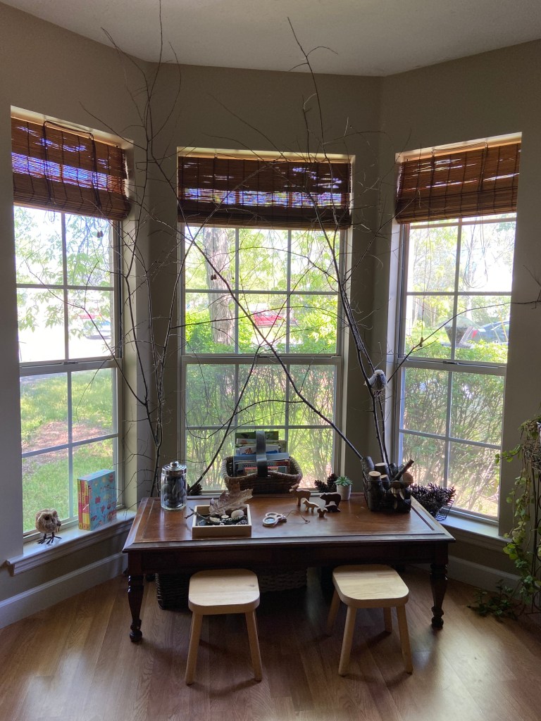 I cut some branches from the yard and zip tied them to the table. I tried to pick branches that would reach out over the table like a canopy. It made a bit of a mess initially and I might have gotten stabbed once or twice, but it was totally worth it. I put together a tray with some natural items, and set out the magnifying glasses for further exploration. I filled a jar with smooth stones and added a basket of pine cones. The books went into a basket on the window sill, but I may end up setting them on the floor off to the side so they’re easier to reach. I like that the basket has a handle so we can bring the books outside or to another part of the house. I added some toy forest animals and a basket of wood logs/coins.