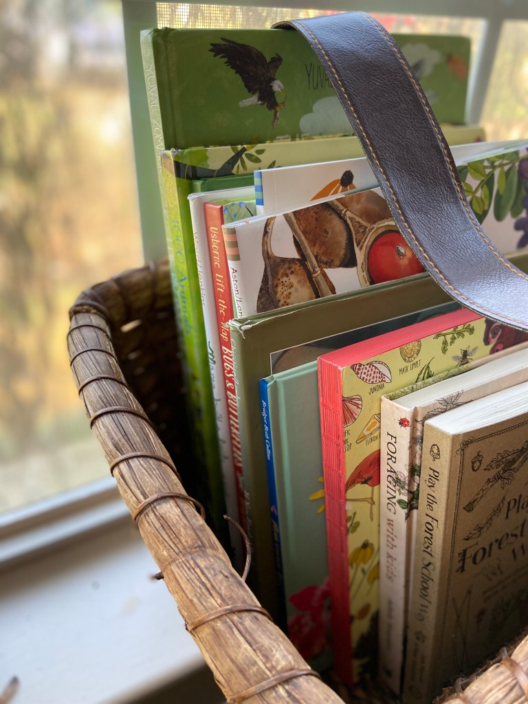 I thought it would be special to bring more of the outdoors in, and have a place to explore some of our natural treasures (mostly the things the kids have picked up and put in their pockets while outside). I spent a few days thinking about what I wanted to include and how we would use it. I had already determined I wanted natural elements, and that inspired the thought of including our nature-related books.