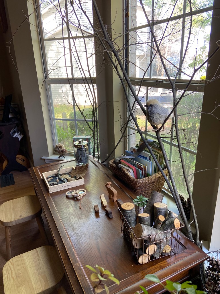 In addition to stools, observing the children use the nature center has prompted me to think about other items I’d like to include and/or rotate. I have some beautiful nature illustrations I’d like to hang, but I want to make or buy some rustic frames for them first. I love the idea of having a bird’s nest in the branches, or perhaps having the kids make their own nests that we can display.