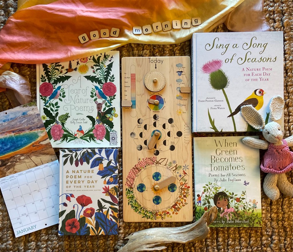 Our good morning song is something my children used to sing at school at the start of their group meeting time, so it both brings back happy memories and also follows an already established routine for them. We take a look at our paper calendar each morning and figure out what the date and day of the week is (side note: for 2021 I got one with pictures of the national parks, so at the start of each new month, we read about the featured park in our National Parks book). We add that to our beautiful perpetual calendar, and then we sing “What’s the Weather?” (a totally silly made up song to the tune of “Oh My Darling Clementine”). The kids will run over to the sliding glass door and we talk about what the weather looks like (which usually includes them sticking their hand, head or whole body outside to tell what the temperature feels like). We adjust the weather and moon on the perpetual calendar, and then we read our poem for the day, usually taken from Sing a Song of Seasons which has a dated poem for every day of the year. I adore it.