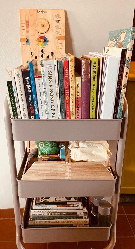 The morning cart has evolved to hold most of the books and materials we might need during our week. I change out the books on the top shelf based on what I have planned for the week, and generally the bottom shelf holds the library books we have checked out. The middle shelf has cards and activities, and also holds math and writing materials like our 100 board. I also keep an indestructible world scrunch map on the cart so it’s handy to look up locations based on our reading or conversation.