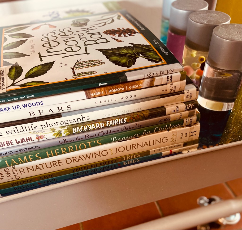 When we started morning time, the kids and I would snuggle up in my bed and we’d read whatever caught our fancy. I assembled what we’ve come to call our “morning cart” with different types of books–nature, story/picture books, biographies, etc. I added in card games like Go Fish and Uno, and some simple math activities like a set of dice that we roll and add together. Sometimes the kids will sit super still and listen during our read-alouds, and other times, their hands need something to do. The morning cart has a handful of sensory bottles, a small set of wooden magnetic blocks, beeswax modeling clay, a couple small clipboards with pencils, wiki stix, and all kinds of picture cards to look through.
